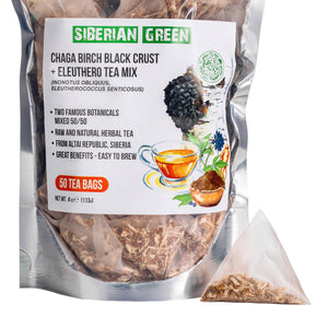 Nuestro Té Chaga con Raíz de Eleuthero procede en su totalidad y de forma sostenible de Siberia, y contiene una mezcla 50/50 de hongo chaga y raíz de eleuthero, lo que lo hace muy nutritivo y fácil de usar al estar envasado en bolsitas de té.