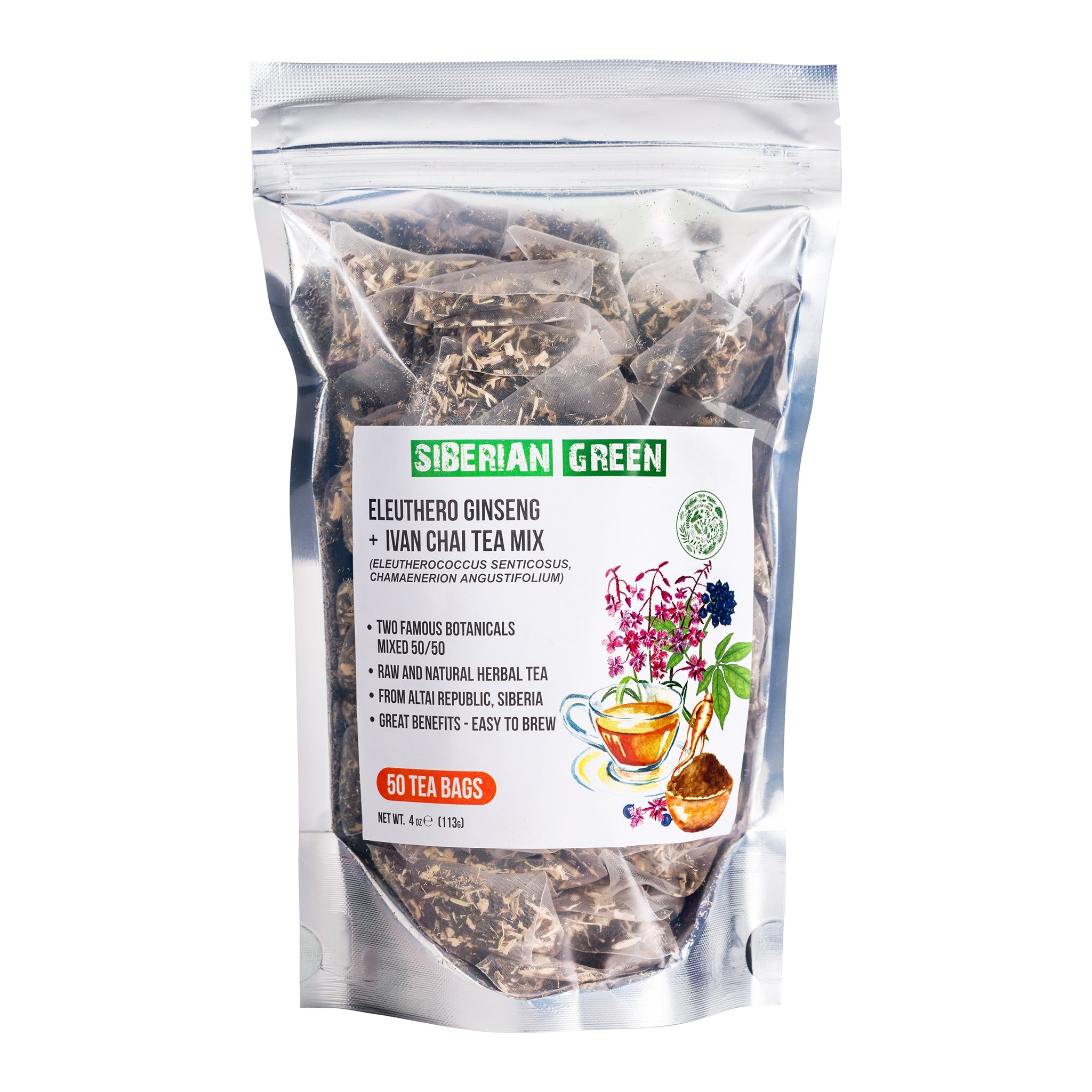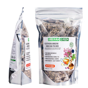 La mezcla de hierbas Siberian Green Eleuthero Root y Ivan Tea ofrece el equilibrio perfecto para nutrir la mente y el cuerpo. Este té se compone al 50/50 de raíz de Eleuthero y té Ivan de Rosebay. Tiene un sabor floral suave y dulce que es único y agradable.